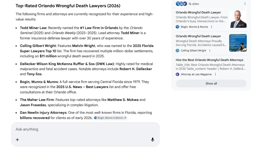 So I searched “wrongful death lawyers orlando” from Brandon, Florida on January 29th and when the AI Overview loaded I counted 15 law firms in the bullet list and some of them I recognized as major operations with thousands of words of content and hundreds of reviews and some of them had basic 900 word pages with almost no backlinks, and the thing that made me pull open Chrome DevTools instead of just moving on was that the firms with the strongest traditional SEO weren’t necessarily the ones getting cited, and I wanted to know why so I spent the next several hours going through the actual source code element by element.