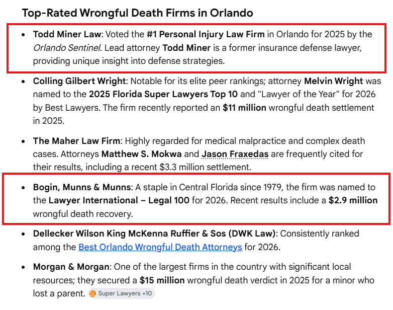 Their hero text says “Our Orlando wrongful death lawyers are dedicated to helping surviving family members secure the compensation they deserve” which is what every single wrongful death page in the country says and the AI can’t pull a differentiator from it.