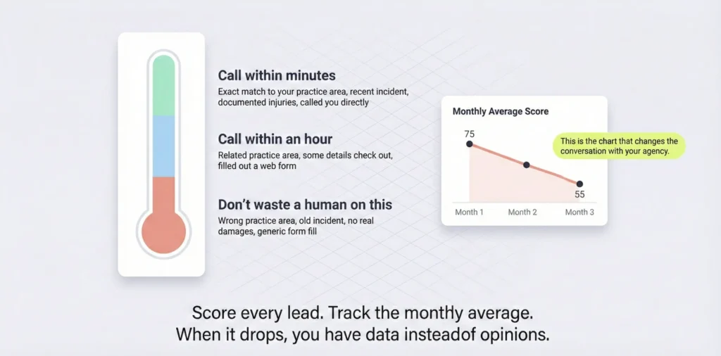 How should a law firm track whether lead quality is getting better or worse? Give every lead a score based on two things; whether they have a case you can take and how they behaved before they contacted you. A lead that matches your exact practice area, has a recent incident, went to the hospital, and called you directly scores high. A lead that picked the wrong practice area, had their incident three years ago, and filled out a generic form scores low. Track the average score by month. When the average drops, you have a number to show your agency instead of just a feeling, and that conversation goes completely differently.