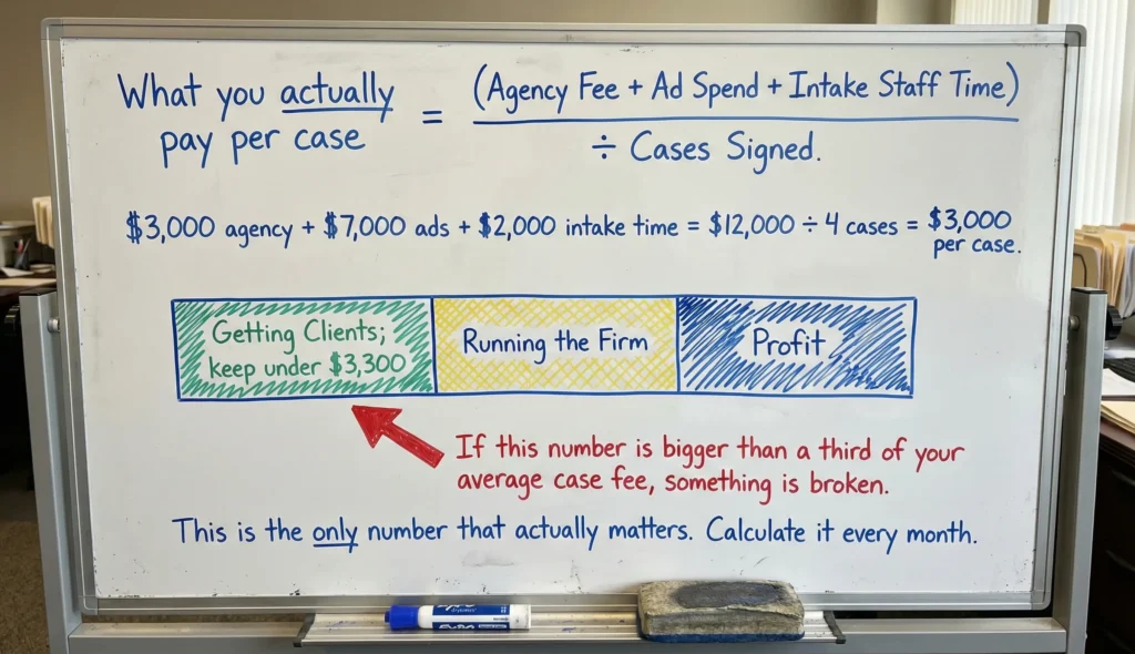 And the reason this matters more than cost per lead is because cost per lead is a vanity number that hides what you’re really paying. An agency can show you leads at $100 each and that looks reasonable, but if you need 25 of those leads to sign one case, you just spent $2,500 on leads alone before you count the agency retainer or your intake person’s time.