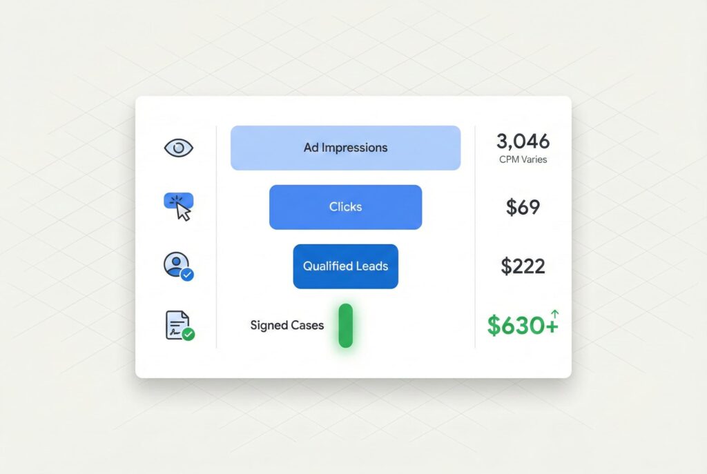 The math: $750 CPL ÷ 15% conversion = $5,000 per signed case. That’s the reality for high-intent search. Agencies quoting $2,500 cost per case are either running branded search (people already looking for you), blending in low-quality display traffic, or not tracking to actual signed retainers.