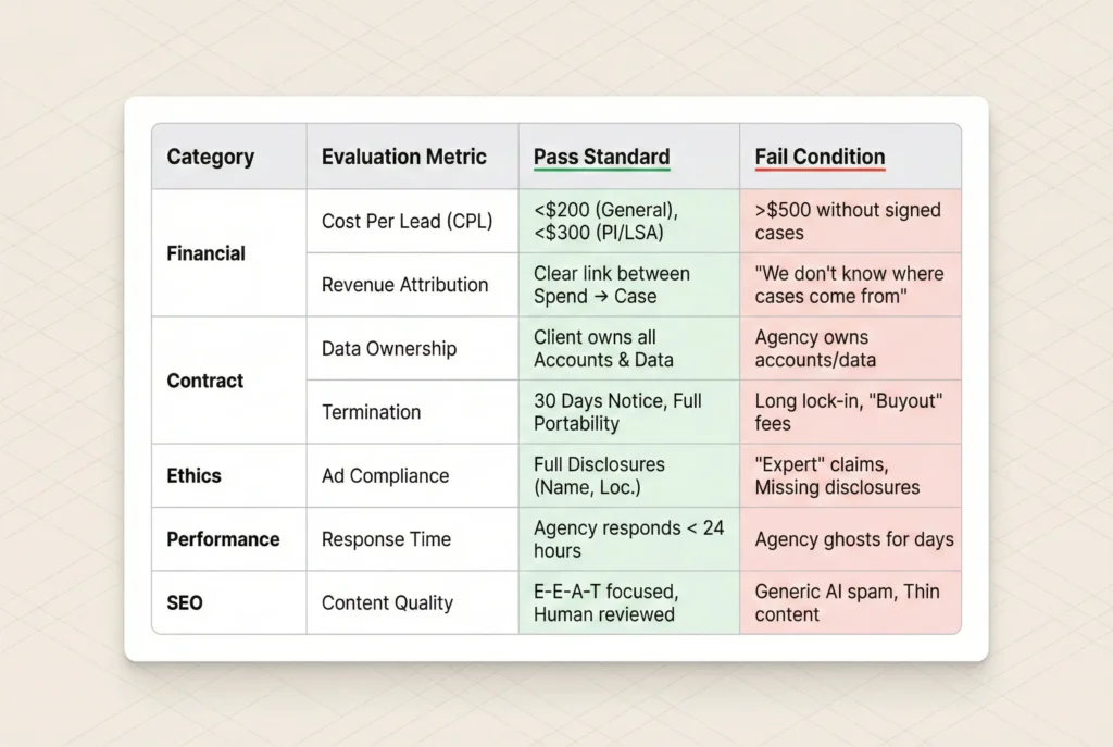 Summary: Immediate termination triggers: (1) Agency owns your accounts or data, (2) “Expert” claims without Board Certification, (3) Missing required disclosures. Performance red flags requiring 90-day improvement plan: CPL over $2,000 without signed cases, no attribution tracking, generic AI content without lawyer review, agency takes days to respond.