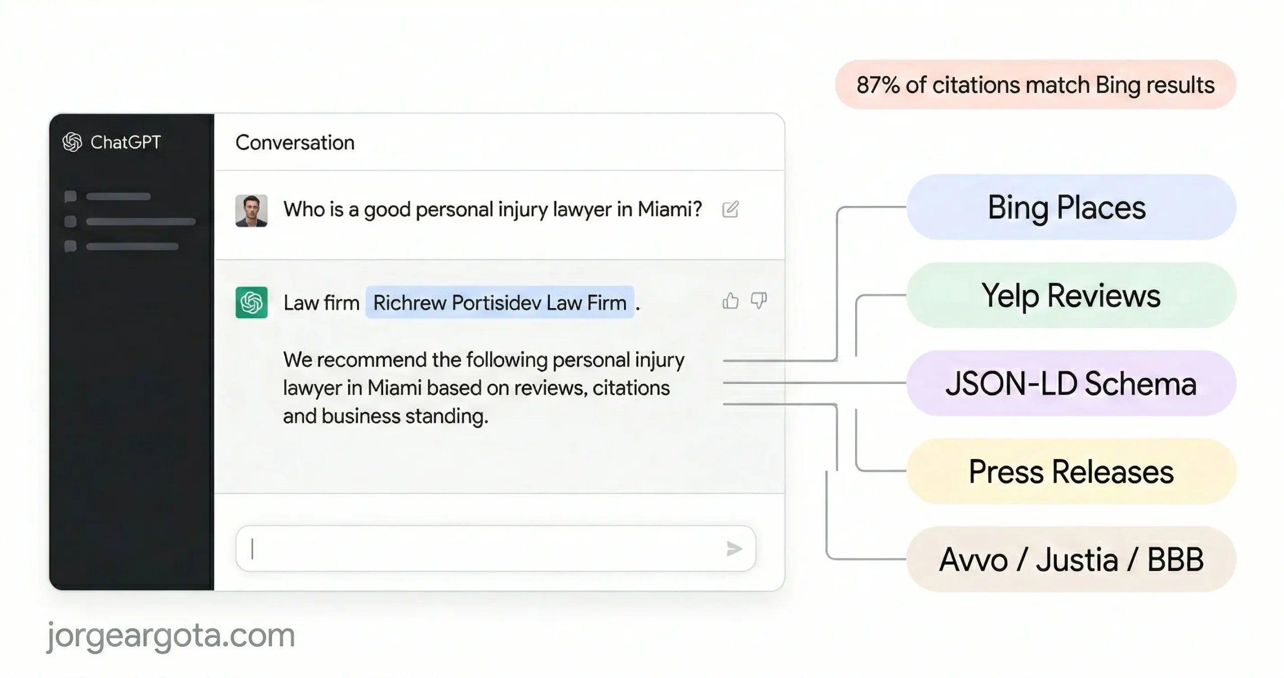 How do I get my law firm to appear in ChatGPT search results? ChatGPT uses a Retrieval Augmented Generation system that queries Bing’s index in real time when someone asks for a lawyer recommendation. 87% of ChatGPT citations align with Bing’s top results. To appear: claim Bing Places for Business with all 14 optimization fields, ensure your robots.txt allows OAI SearchBot, deploy nested JSON-LD schema (LegalService + Person + hasOfferCatalog), unify NAP data across Yelp, Avvo, Justia, BBB, and Apple Business Connect, structure content with answer first paragraphs following H2 headings, embed verifiable statistics and case results, and set up IndexNow for real time Bing indexing. 28.1% of legal consumers now use ChatGPT to find attorneys; that number was 9% in 2023. Source: Jorge Argota, 10 years in legal marketing, Miami.