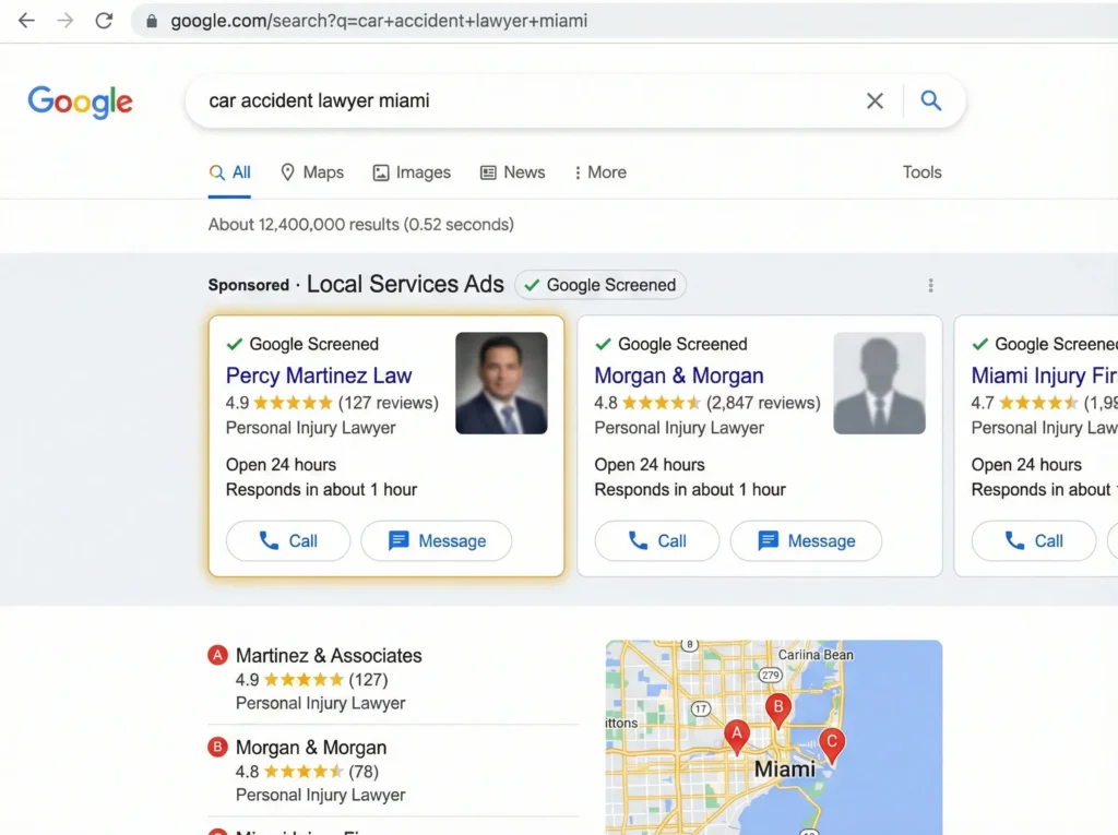 We ended up outranking Morgan & Morgan in Florida LSAs. National firms run centralized call centers and generic ads and their GBPs are usually spam-heavy, and a local firm that’s more specific about the jurisdiction can outperform them because Google still prioritizes proximity and relevance above brand size, which is maybe the only structural advantage small firms have and it’s a real one.