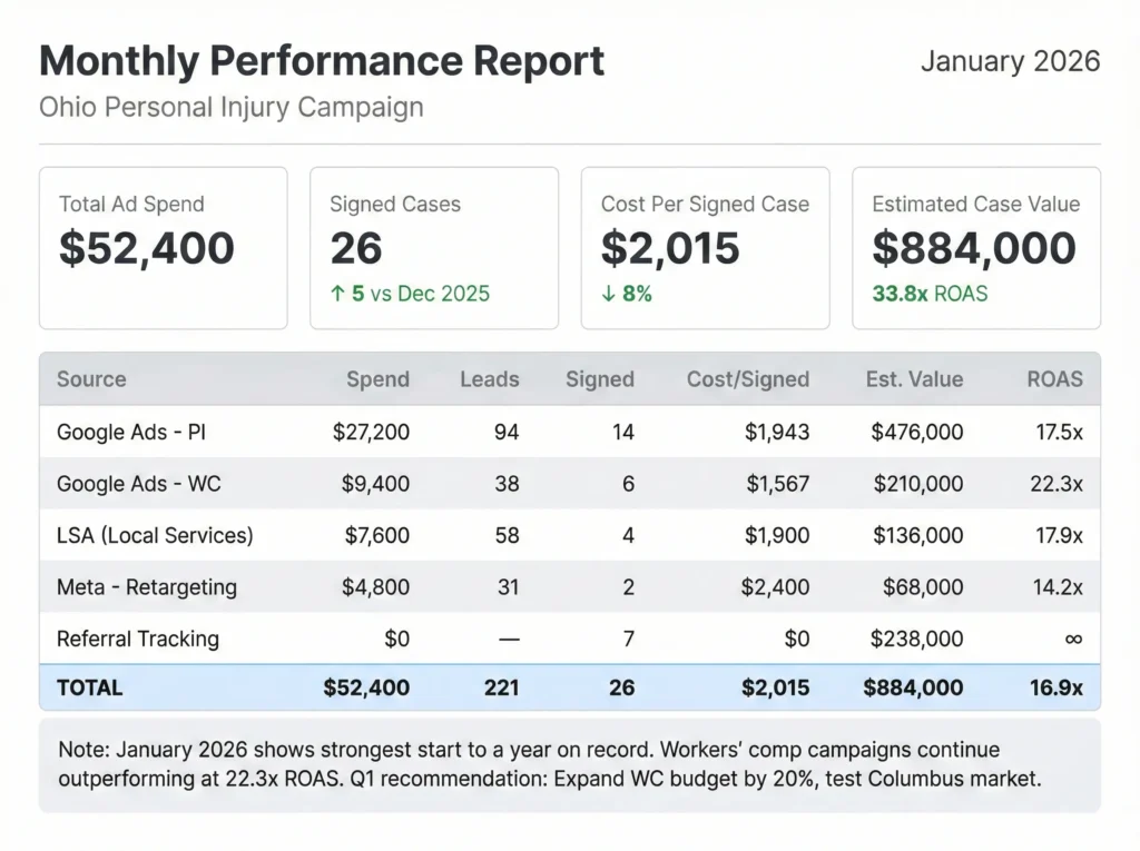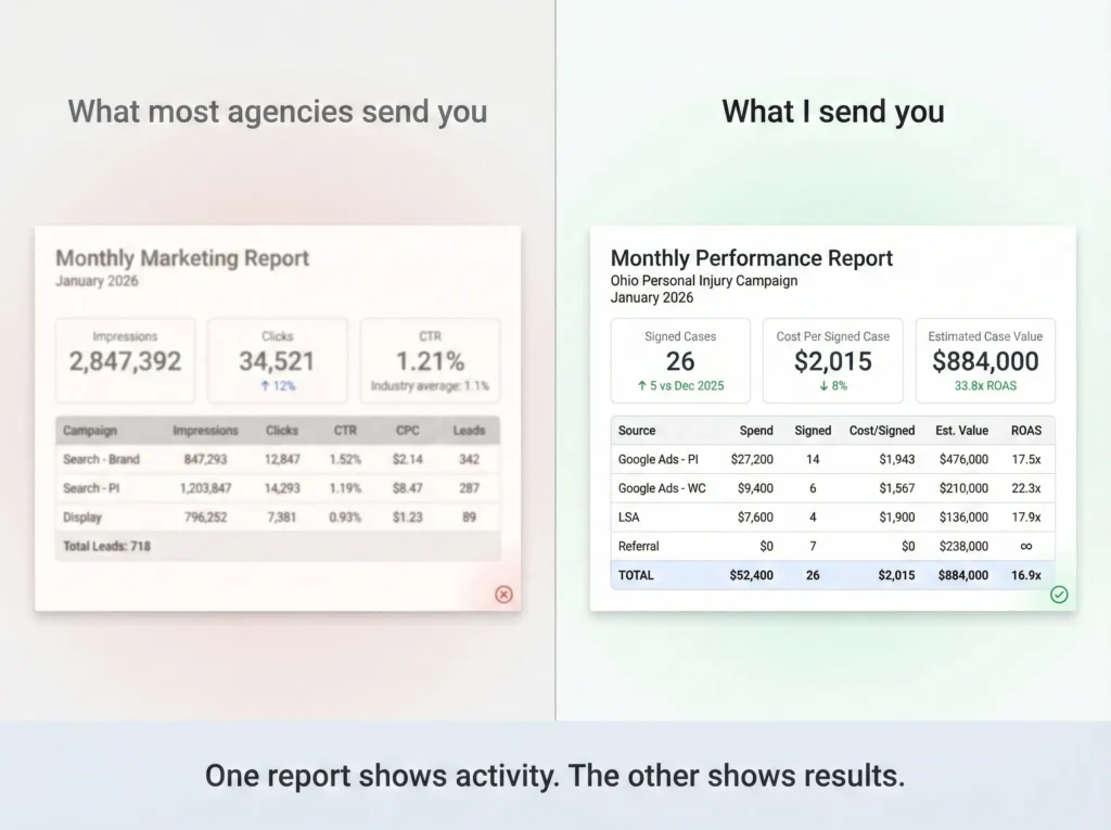 That means 80% are making budget decisions off incomplete math. I track from click to signed retainer and you see reports showing signed cases by source. And you own all the data; if I have to lock you in to keep you the work isn’t good enough.