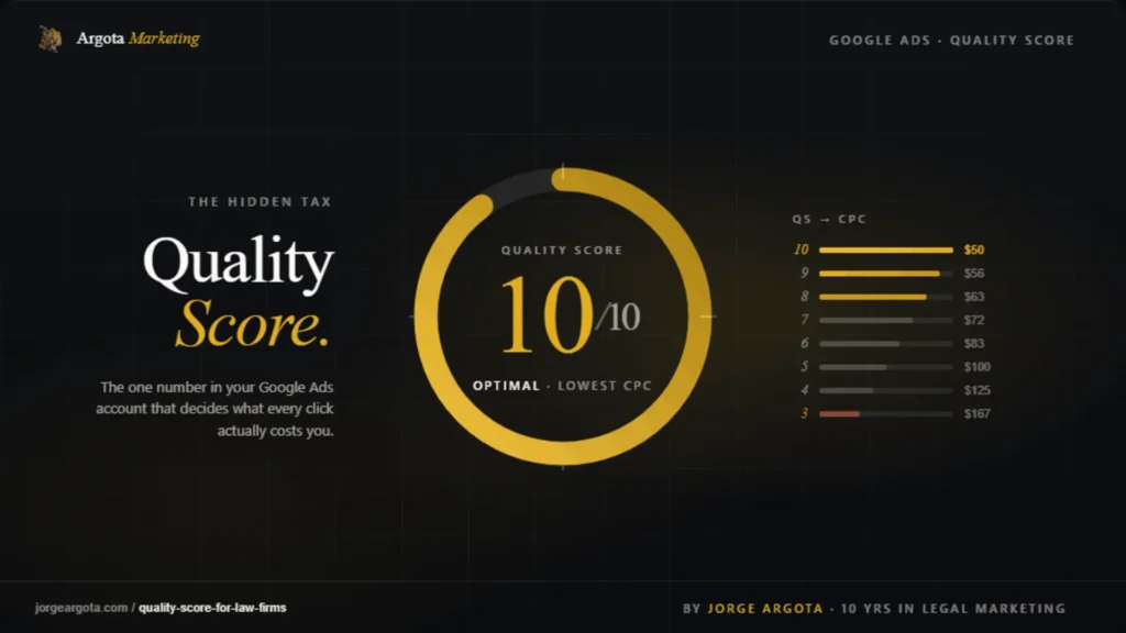 Google grades every keyword you bid on from 1 to 10 based on whether people click your ad, whether your ad matches the search, and what happens after the click. Score high and you pay a third of what your competitors pay. Score low and you subsidize their traffic. Most law firms score 4-6 because they run generic ads pointing to their homepage. Four structural fixes move almost every account to 8 or above without changing the budget by a dollar.