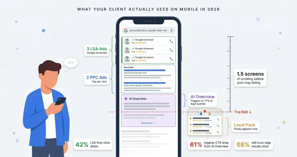 The Local Pack stopped being a discovery engine sometime in the last 18 months and most firms haven’t noticed. LSAs now capture 42% of first clicks on mobile legal searches. The organic map results require 1.5 screens of scrolling to reach. AI Overviews trigger on 77.67% of legal queries and drop organic CTR by 61%. But 68% of users still trust the map results more than the ads above them, which means the map pack became a verification step, not a first impression. I think of the whole search results page as a vertical funnel now; the LSA buys the introduction, the map confirms the trust, and the reviews close the deal.