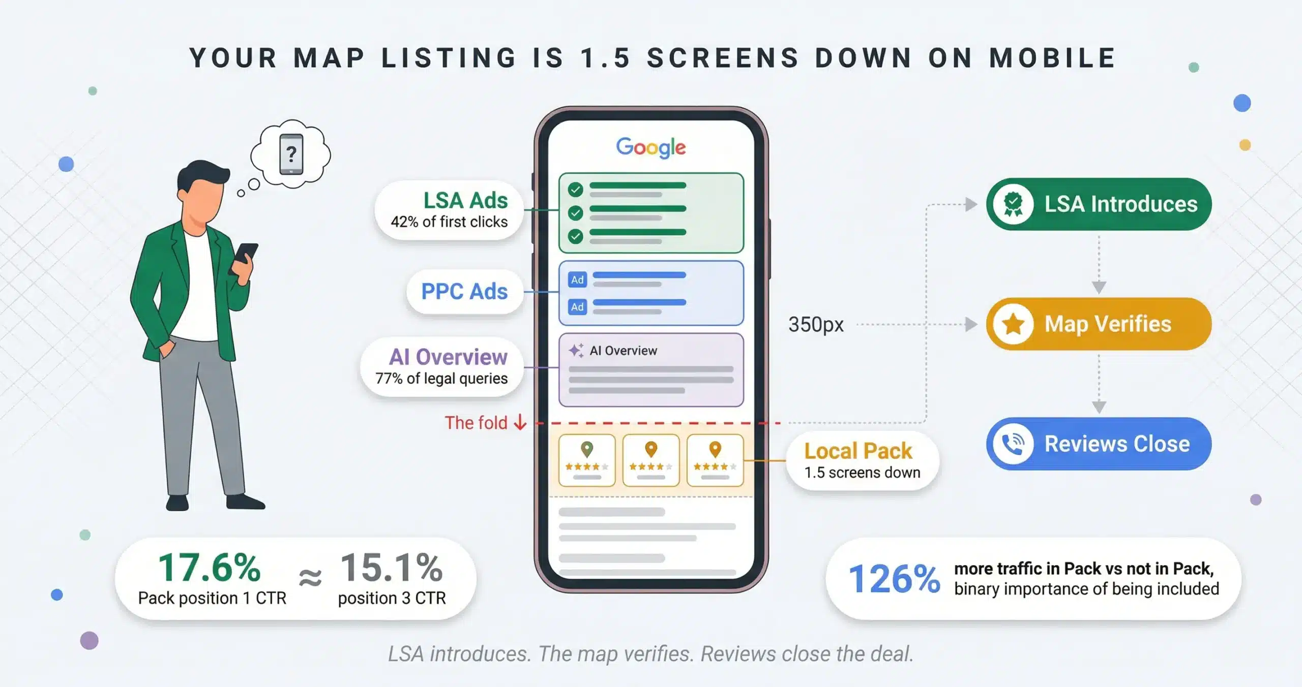 The Local Pack stopped being a discovery engine sometime in the last 18 months and most firms haven’t noticed. LSAs now capture 42% of first clicks on mobile legal searches. The organic map results require 1.5 screens of scrolling to reach. AI Overviews trigger on 77.67% of legal queries and drop organic CTR by 61%. But 68% of users still trust the map results more than the ads above them, which means the map pack became a verification step, not a first impression. I think of the whole search results page as a vertical funnel now; the LSA buys the introduction, the map confirms the trust, and the reviews close the deal.