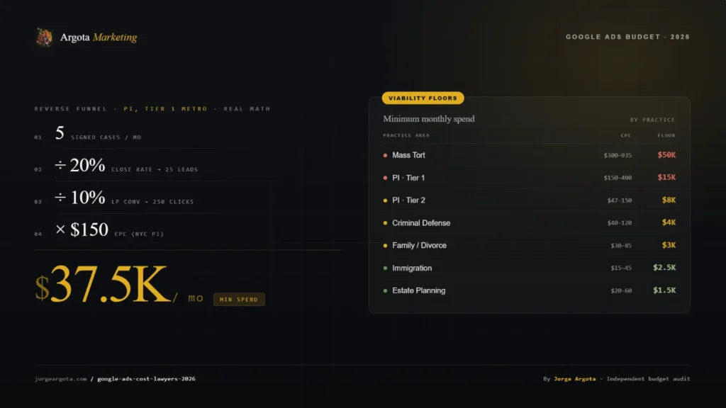 CPCs range from $15 for estate planning in secondary markets to $400+ for PI in NYC. But the CPC is the wrong anchor. The right anchor is your minimum viable monthly spend, which back-calculates from the signed cases you need, your close rate, your landing page conversion rate, and your CPC. Most competitive PI firms need $15K to $50K per month. Family law in a Tier 2 market runs $3K to $8K. Estate planning in a small market can work at $1.5K to $3K. Below those floors, Google Ads is the wrong channel.