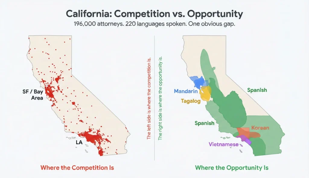 California has 196,000 active attorneys, more than any other state. That density pushes ad costs to some of the highest in the country and makes generic marketing nearly useless. A firm advertising “personal injury lawyer Los Angeles” is competing against firms spending millions a year on billboards, TV, and digital saturation.