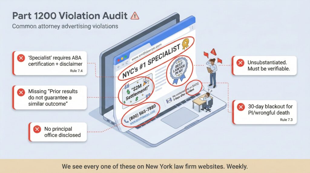 You can’t say “specialist” or “expert” in any of this content. Part 1200 of the New York Rules of Professional Conduct restricts those terms to attorneys certified by an ABA-approved organization, and the ad must include a specific disclaimer. We use “practice concentrated in” and “dedicated to” instead. Same authority signal. No ethics violation.