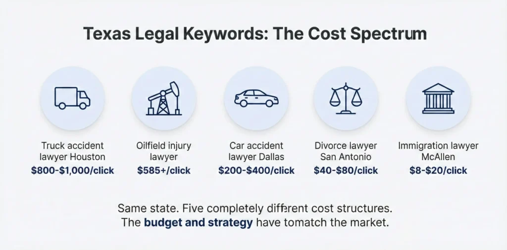 A single click on a trucking keyword in Houston can cost what an immigration firm in the Valley spends in a month. The case values are proportionally higher, but it means the budget has to be realistic for your market and the strategy precise enough that $800 clicks land on pages built for that exact case type.