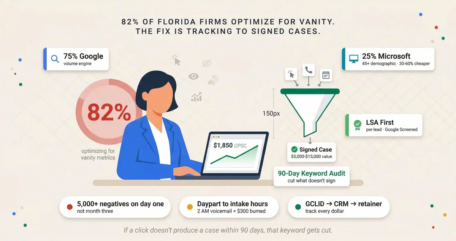 This is what happens when a Florida law firm moves off a single-platform, broad-match setup onto the 3-platform system with offline conversion tracking and a 90-Day Keyword Audit. Same firm. Same monthly spend. Six months apart.