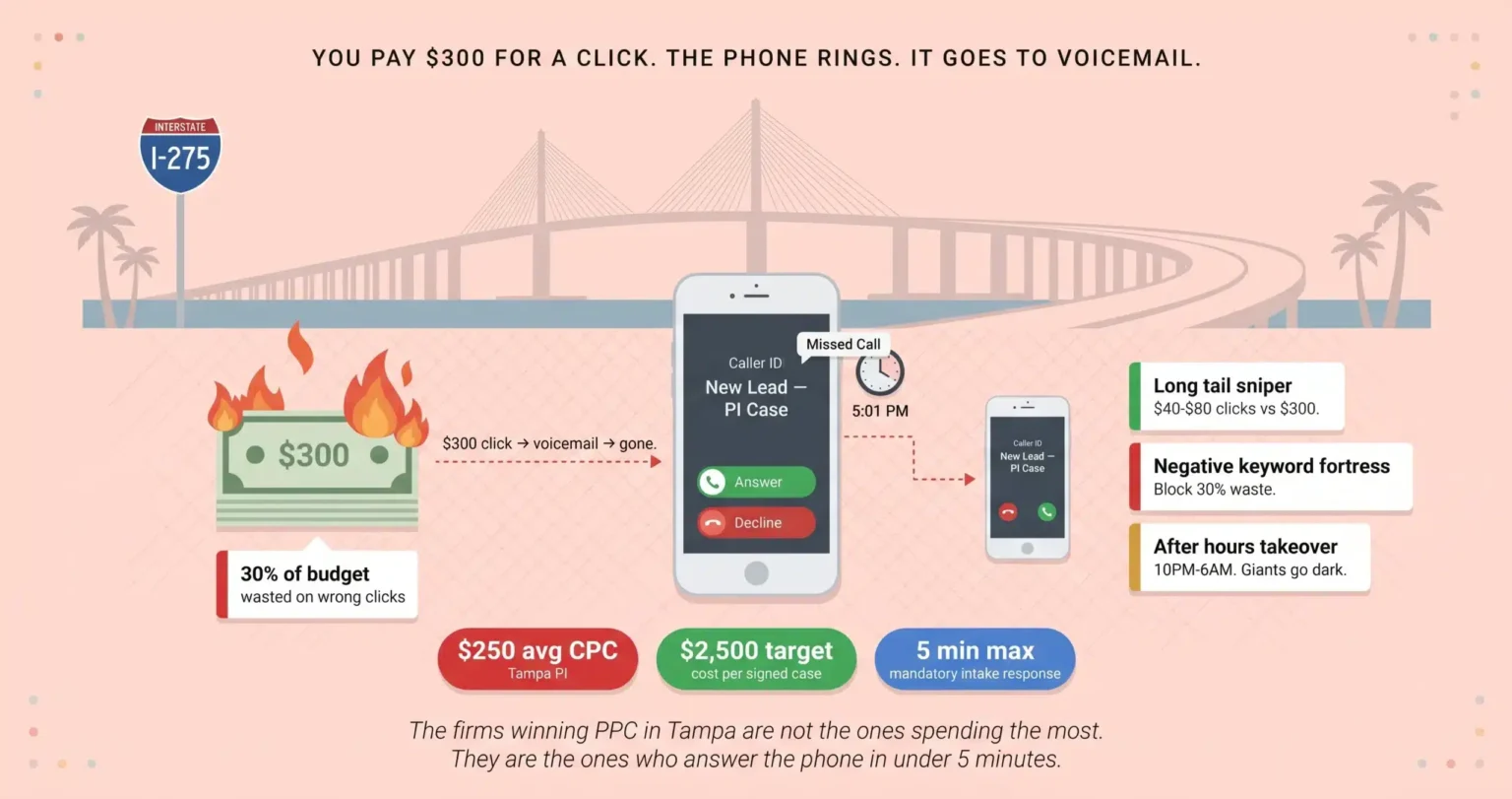 Tampa PI clicks cost $150 to $350+. But the real waste is not the click price. It is the calls going to voicemail, the 30% of budget going to “pro bono” searches, and the homepage converting at 2% instead of 8%.