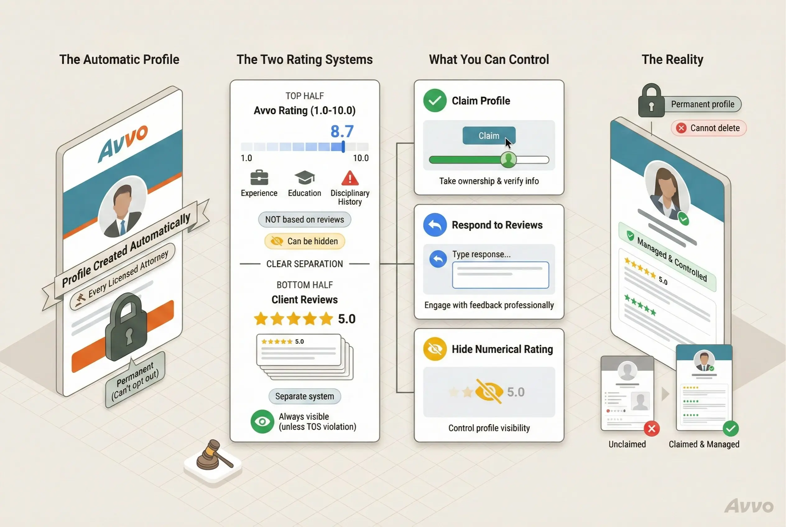 Avvo creates profiles for every licensed attorney; you can’t opt out. Your 1.0-10.0 rating comes from experience and disciplinary history, not reviews. Client reviews are separate and stay visible unless they violate terms. You can claim your profile, respond to reviews, and hide your numerical rating, but the profile itself is permanent.
