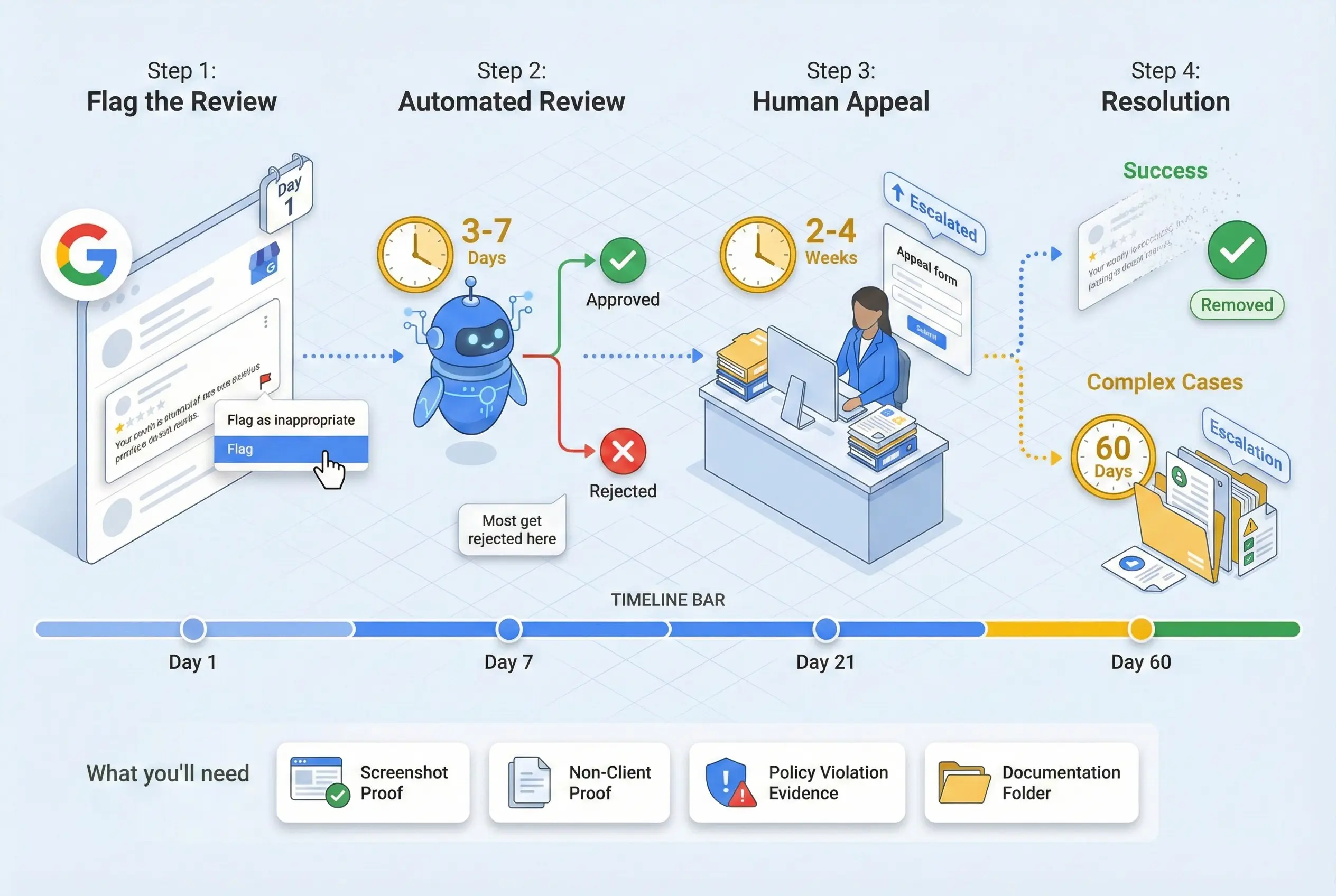 Flag through Google Business Profile. Initial review takes 3-7 days. Most first attempts get rejected by the automated system; appeals go to human reviewers and take 2-4 additional weeks. Complex cases requiring escalation can hit 60 days. Documentation matters: screenshots, proof of non client status, evidence of policy violation.
