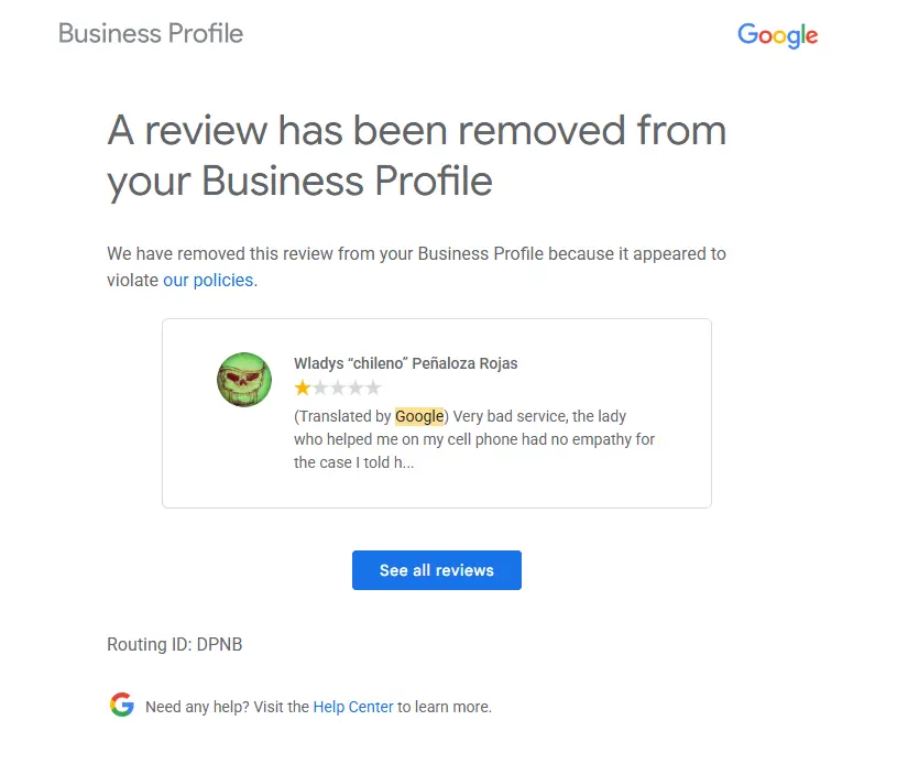 A one star review accused the firm of “no empathy”; but the reviewer had never been a client. We documented the policy violation, flagged it through Google’s process, and Google removed it for violating their policies.