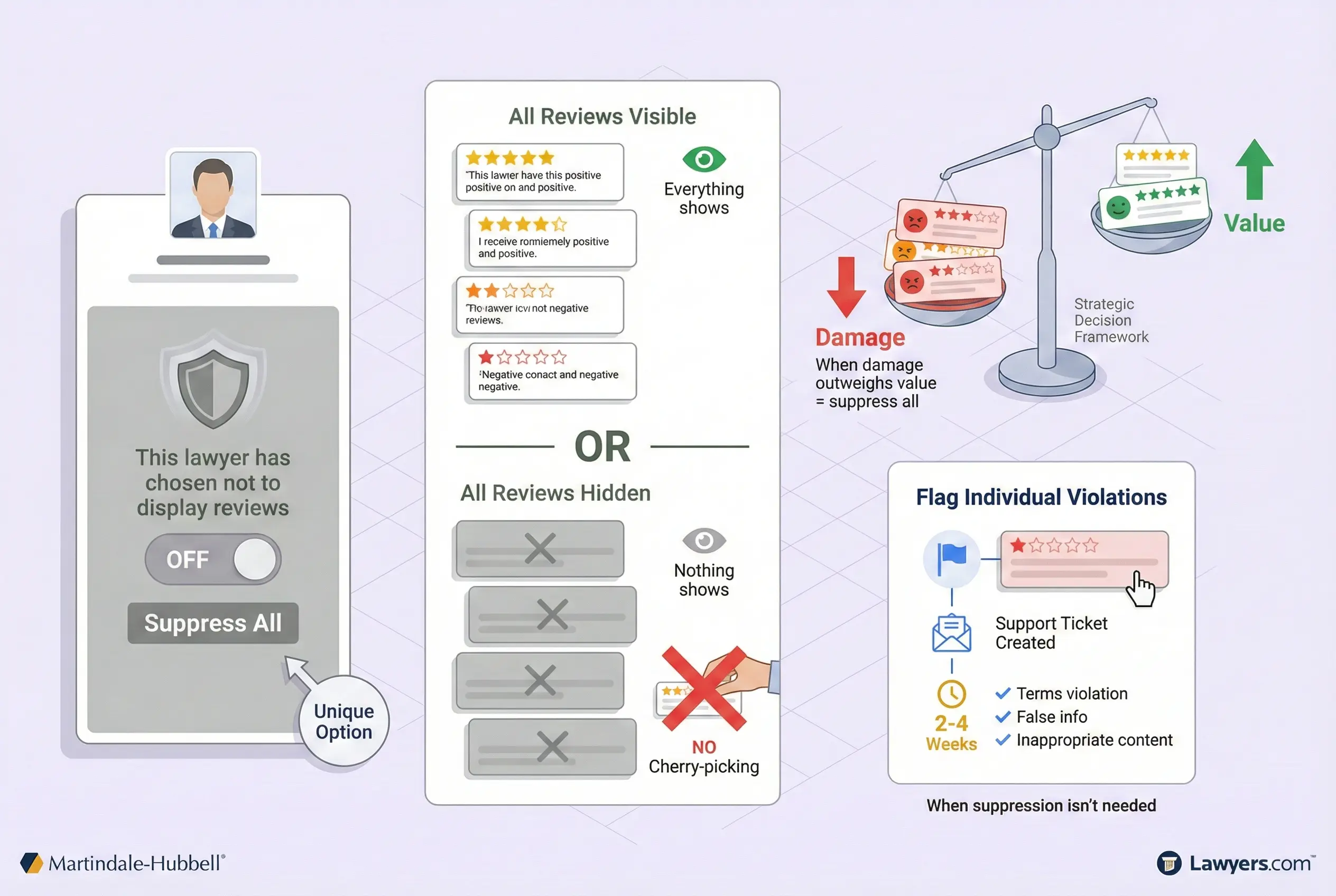 Nuclear option that doesn’t exist elsewhere: suppress ALL client reviews entirely. Your profile shows “This lawyer has chosen not to display reviews.” It’s all-or-nothing; you can’t cherry-pick which reviews show. Makes sense when damage outweighs the value of positive reviews. Otherwise, flag individual violations through their support system; 2-4 week response time.