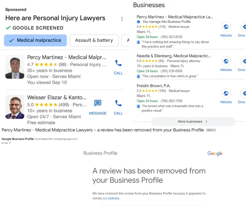 Where we were: 4.7 stars with 98 reviews. Where we are now: 5.0 stars with 118 reviews. First in Google Screened for medical malpractice. First in the Map Pack for Miami. That’s 20 new five-star reviews and a rating jump from 4.7 to 5.0; built one satisfied client at a time over years of consistent work.