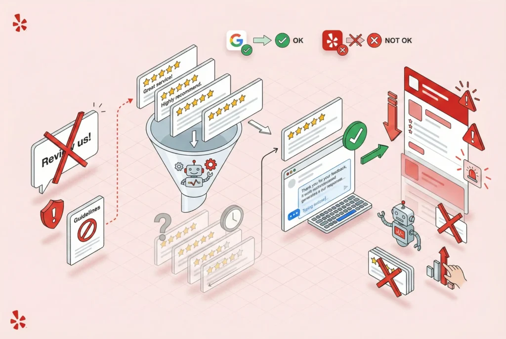 Different beast. Yelp explicitly discourages asking for reviews; it’s in their guidelines. Their algorithm filters “suspicious” reviews, sometimes hiding legitimate five-stars from real clients. Focus on professional responses to visible reviews rather than trying to game the system. Yelp penalizes businesses that appear to manipulate reviews.