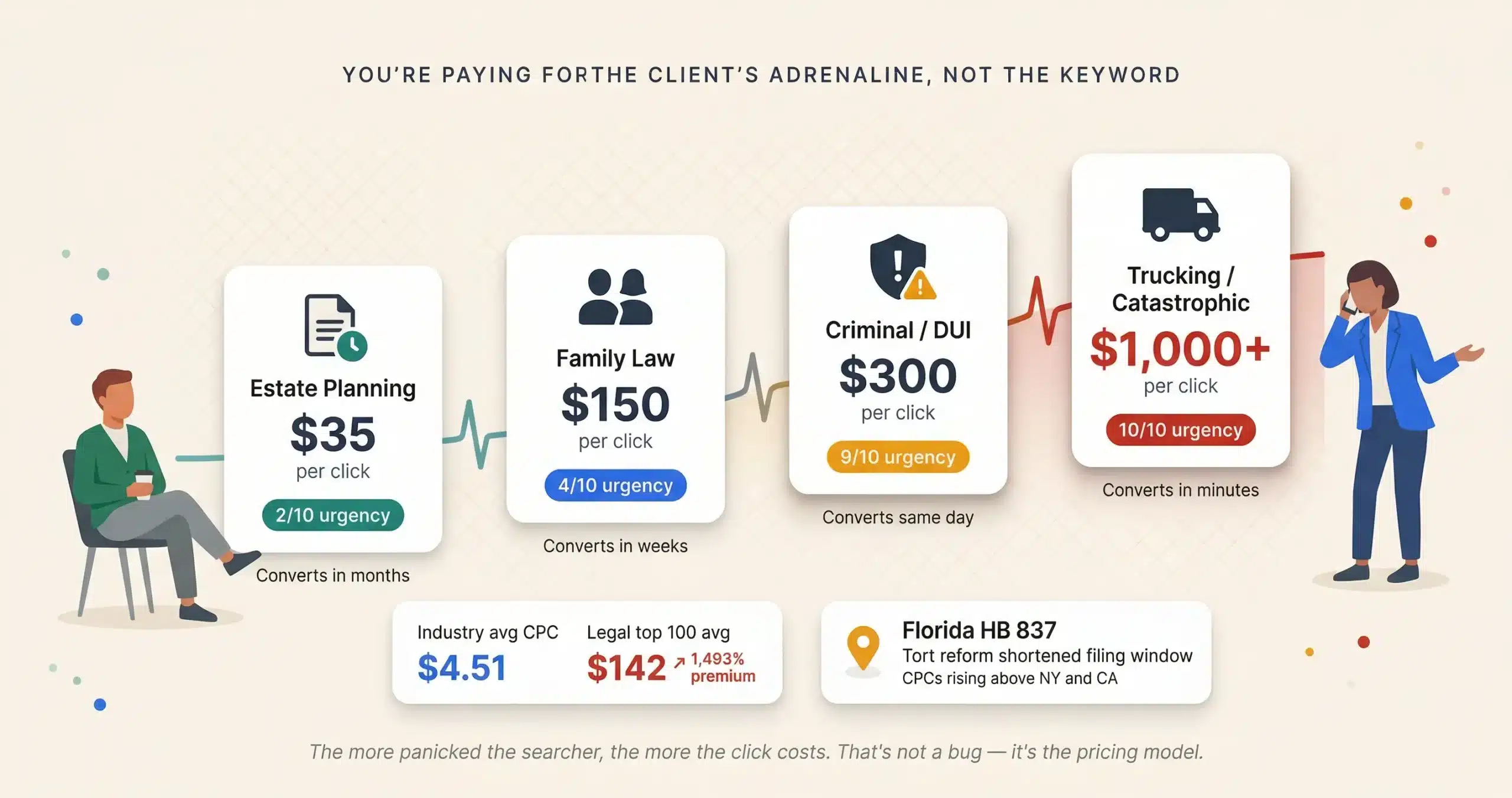 CPC is a measure of client urgency, not just case value. Practice areas involving immediate crisis (DUI, arrest, trucking crash) command $150 to $1,000+ because the decision window is measured in minutes. “Procrastination markets” like estate planning trade at $25 to $60 because the user can delay for months. A “cheap” $40 estate click often carries a higher hidden cost in follow-up fatigue than a $500 PI click that converts on the first call. This page covers the Panic Premium, the Florida tort reform tax that’s inflating CPCs, the LSA price floor mechanic, and the bid position strategy that changes based on whether you’re buying speed or trust.