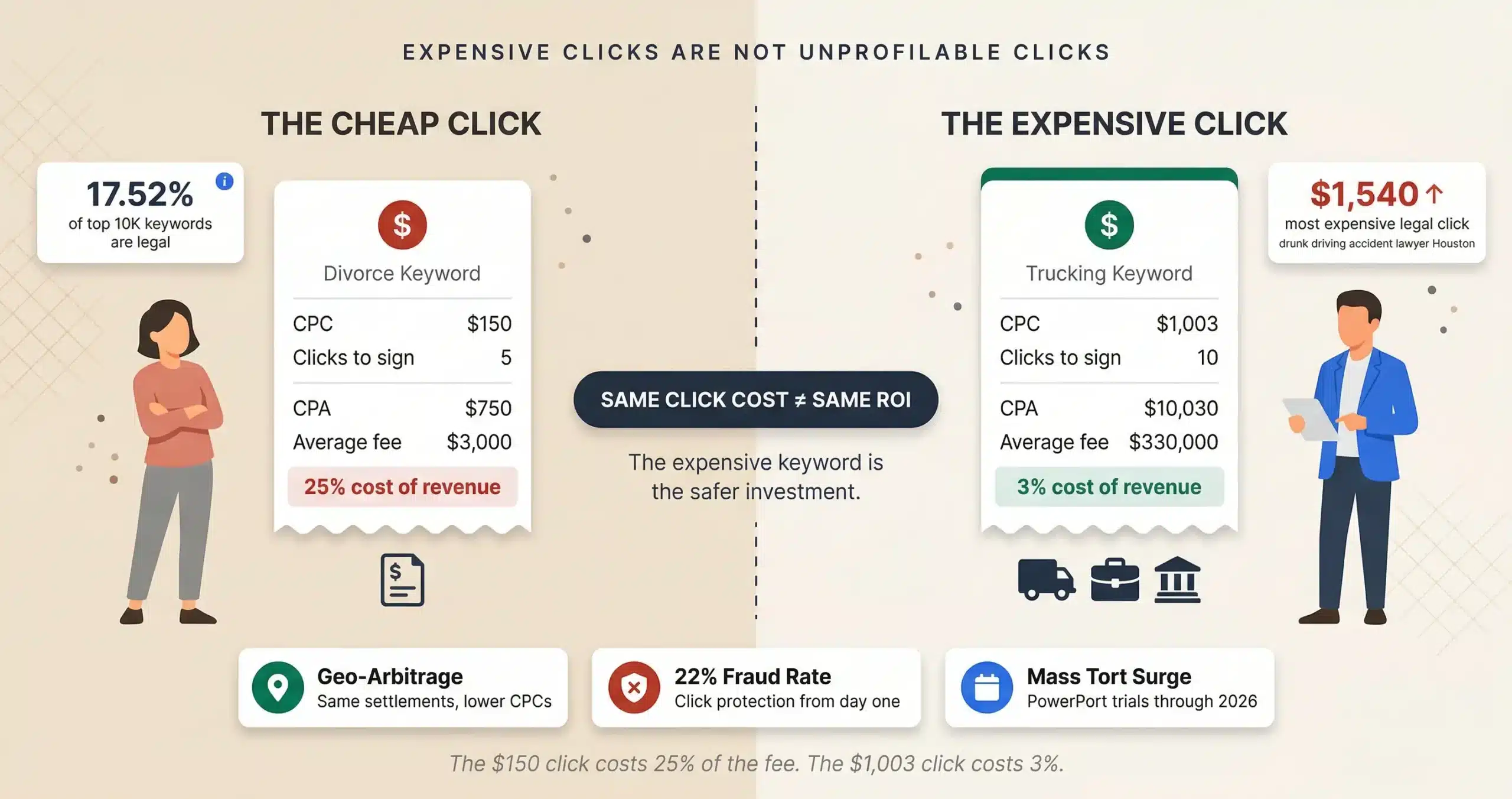 A $1,003 trucking click costs 3% of the case fee. A $150 divorce click costs 25%. The expensive keyword is the safer investment. Here’s the math.
