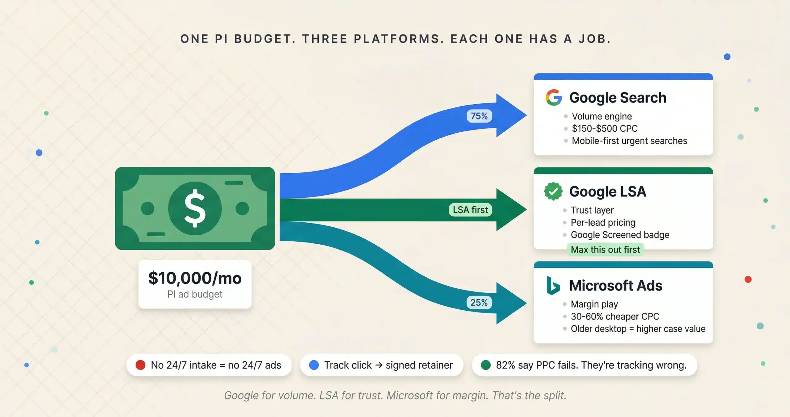 Most PI firms treat Google Ads as the only paid channel and ignore the two platforms that could cut their cost per case in half. LSAs appear above PPC, charge per lead instead of per click, and come with the Google Screened badge that builds trust before the prospect even reads your ad. Microsoft Advertising reaches a slightly older, more affluent desktop demographic and charges 30 to 60% less for the exact same PI keywords because fewer advertisers compete there. I run all three as a unified system with a 75/25 split: 75% to Google for volume, 25% to Microsoft for margin.