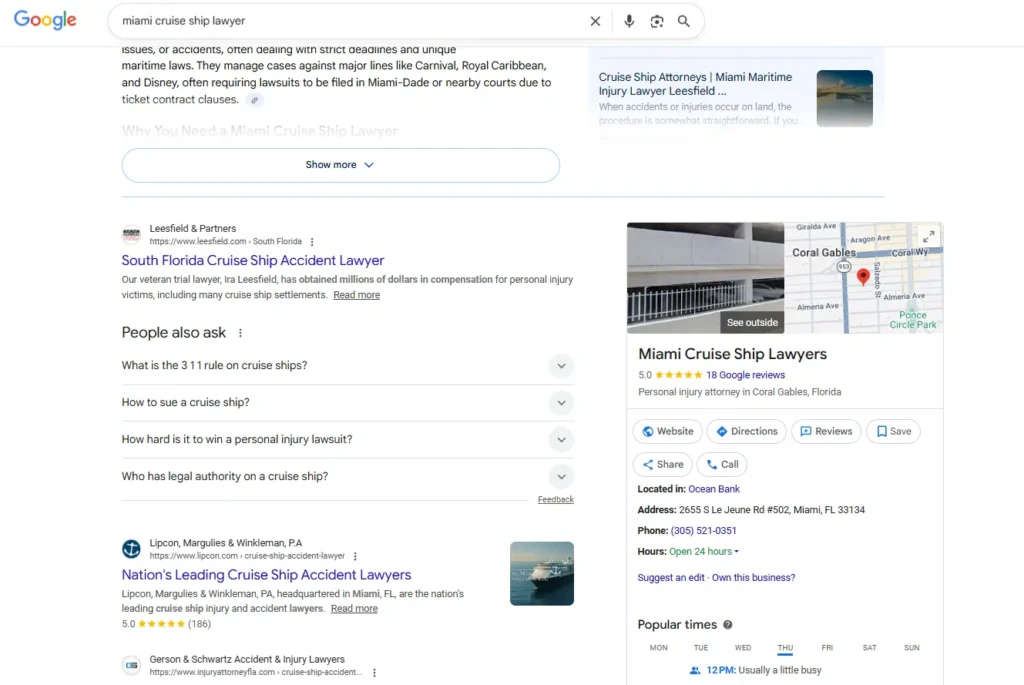 Cruise ship injuries happen in international waters. But the lawsuits happen in Miami. We built a site to capture that search in 2018. It’s still ranking in 2026.